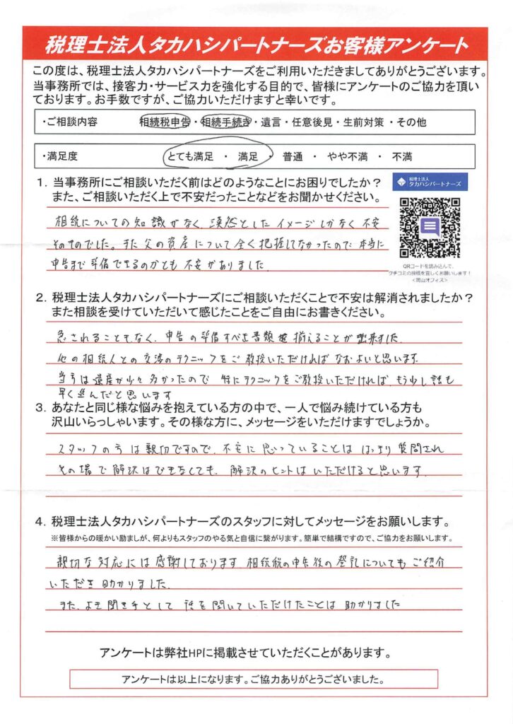 親切な対応には感謝しております。相続税の申告後の登記についても、ご紹介いただき助かりました。また、よき聞き手として話を聞いていただけたことは助かりました。