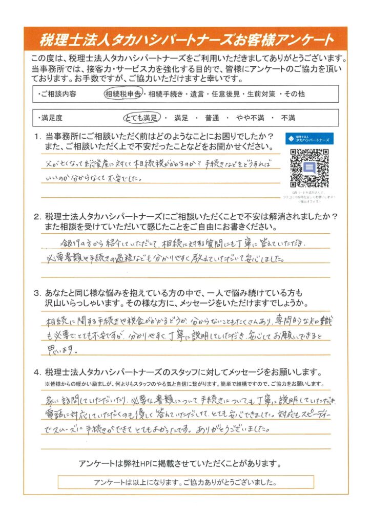 銀行の方から紹介いただいて、相続に対する質問にも丁寧に答えていただき、必要書類や手続きの過程なども分かりやすく教えていただいて安心しました。