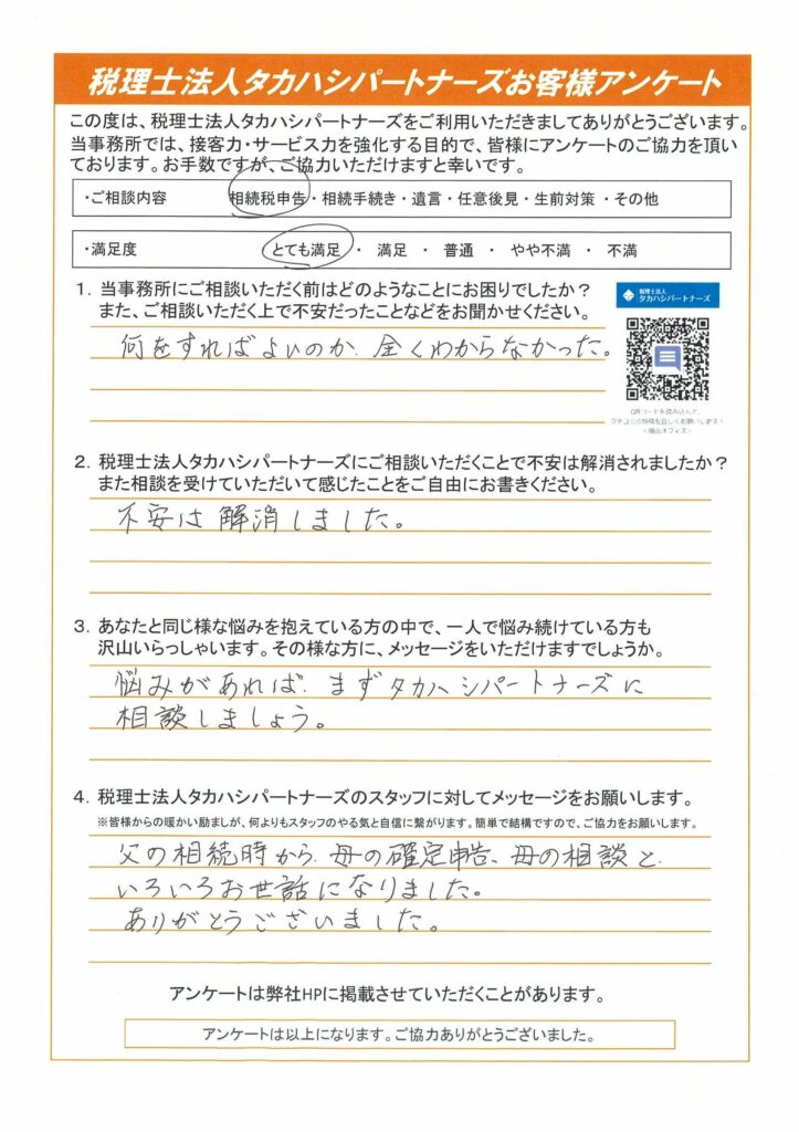父の相続時から、母の確定申告、母の相談といろいろお世話になりました。ありがとうございました。