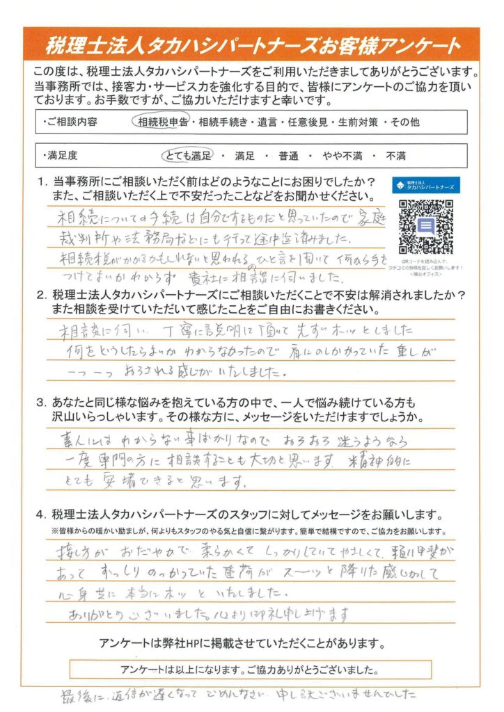 相続についての手続きは自分でするものだと思っていたので、家庭裁判所は法務局などにも行って途中まで済みました。「相続税がかかるかもしれないと思われる」のひと言を聞いて、何から手を付けてよいかわからず、貴社に相談に伺いました。