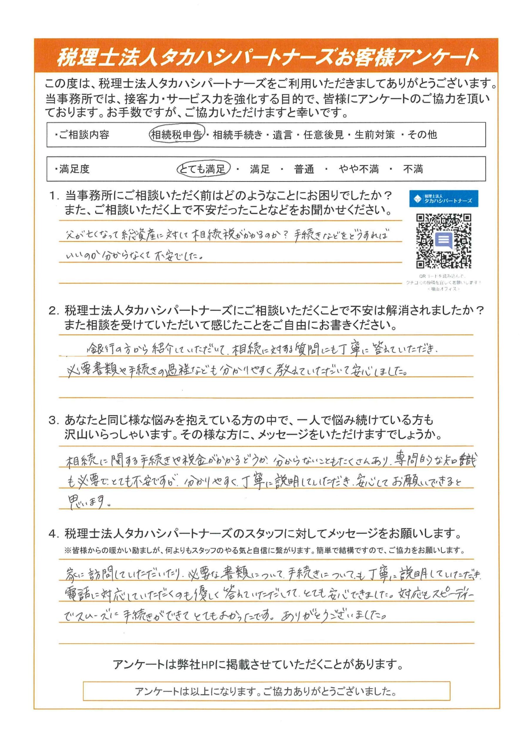 自分で相続の手続きをするのは大変です。手続きの多さに疲れましたが、無事相続税申告ができました。ありがとうございました。