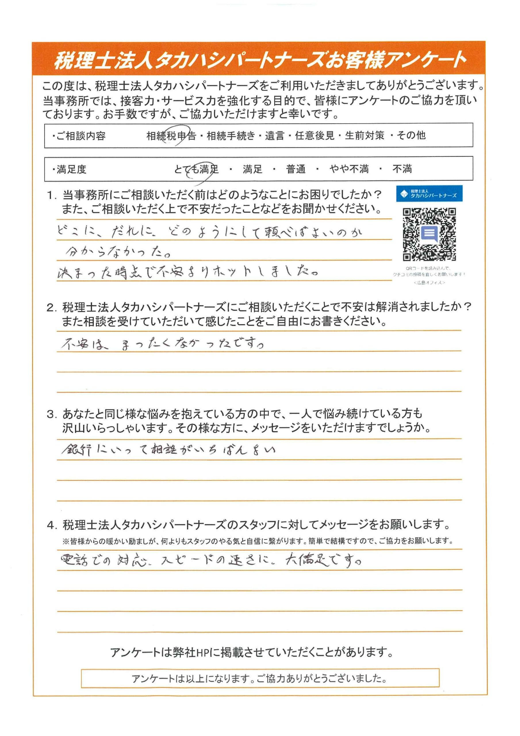 必要書類を細かくチェックして(故人の生活費管理をしていたので)不審な動きがないことを確認してもらえたことで安心できた。土地の評価は専門家にお任せして良かった。